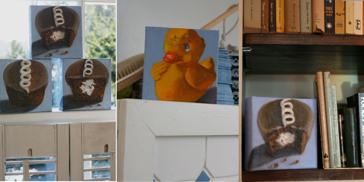 Each of these cute Little Boxes are 5" x 5" x 1.5" gallery-wrapped canvases that can stand alone on a shelf, bookcase or windowsill. These small paintings are light enough to hang from a single push pin on the wall. At $55 each, you can group or stack them.